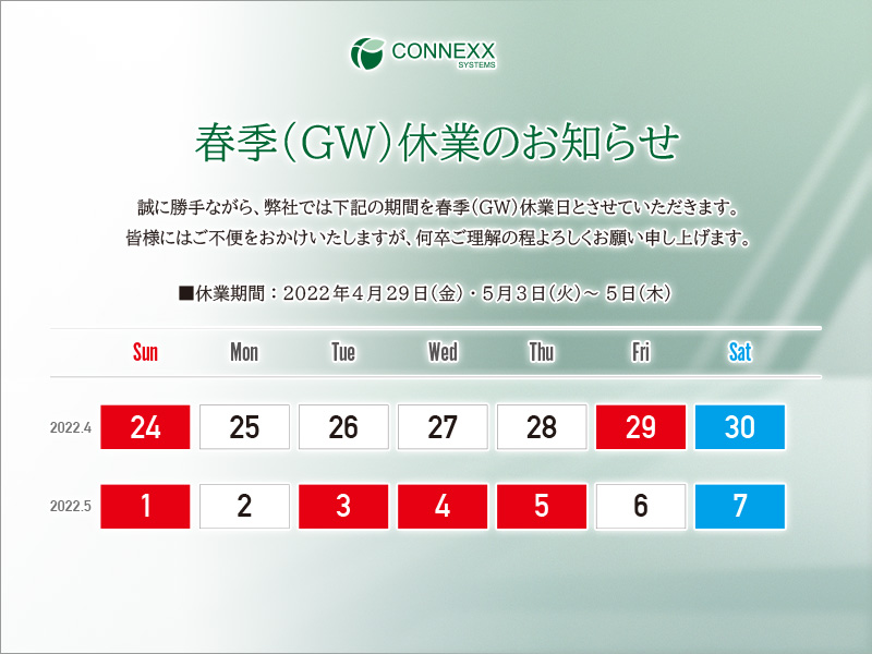 誠に勝手ながら、弊社では下記の期間を春季(GW)休業日とさせていただきます。